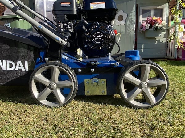 In terms of spec, the blade speed is 3300rpm, which is powered by the 163cc Briggs & Stratton 750 Series engine, and it gets used for longer periods on some of the most demanding lawns in autumn and again in spring. It has a strong steel chassis and 22 steel carbon-tipped blades, so slightly more than the Hyundai model I also own. The blades are sharp and, more importantly, can be replaced once they get blunt, so spares are not a problem. We usually get them ordered from our local mower service centre.