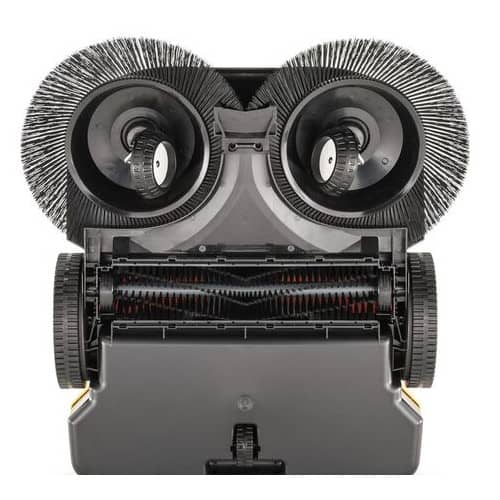 This Karcher sweeper operates with two side brushes. The advantage of side brushes is that they go right up to the edge of walls, borders or other enclosures around your space. Reviewers report that the brushes are lightweight and soft and don’t handle wet or heavy material well. This sweeper does pick up dirt, dust and light dry debris well though. You store the brushes conveniently away in the waste collector bin (after you’ve emptied it).