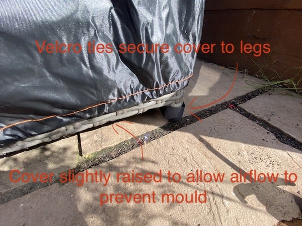 If the wind gets under your furniture covers, they will puff up and maybe race away across the garden. Tying them down solves these problems. Some covers have drawstring ties around the bottom of the cover to cinch it in around your furniture and stop the covers from leaving during high winds and storms. Other methods of fastenings are edging the covers with elastic, reinforced ties, straps with buckles, velcro and zippers